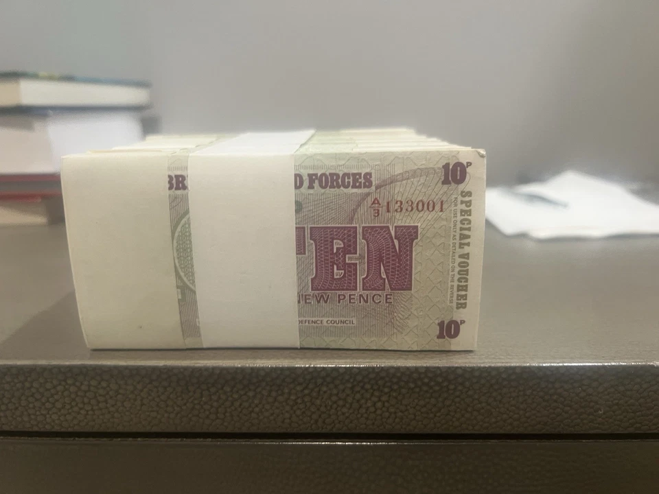 These vouchers were issued by the UK Ministry of Defence as military payment certificates and used exclusively within Armed Forces establishments following decimalisation in 1972.